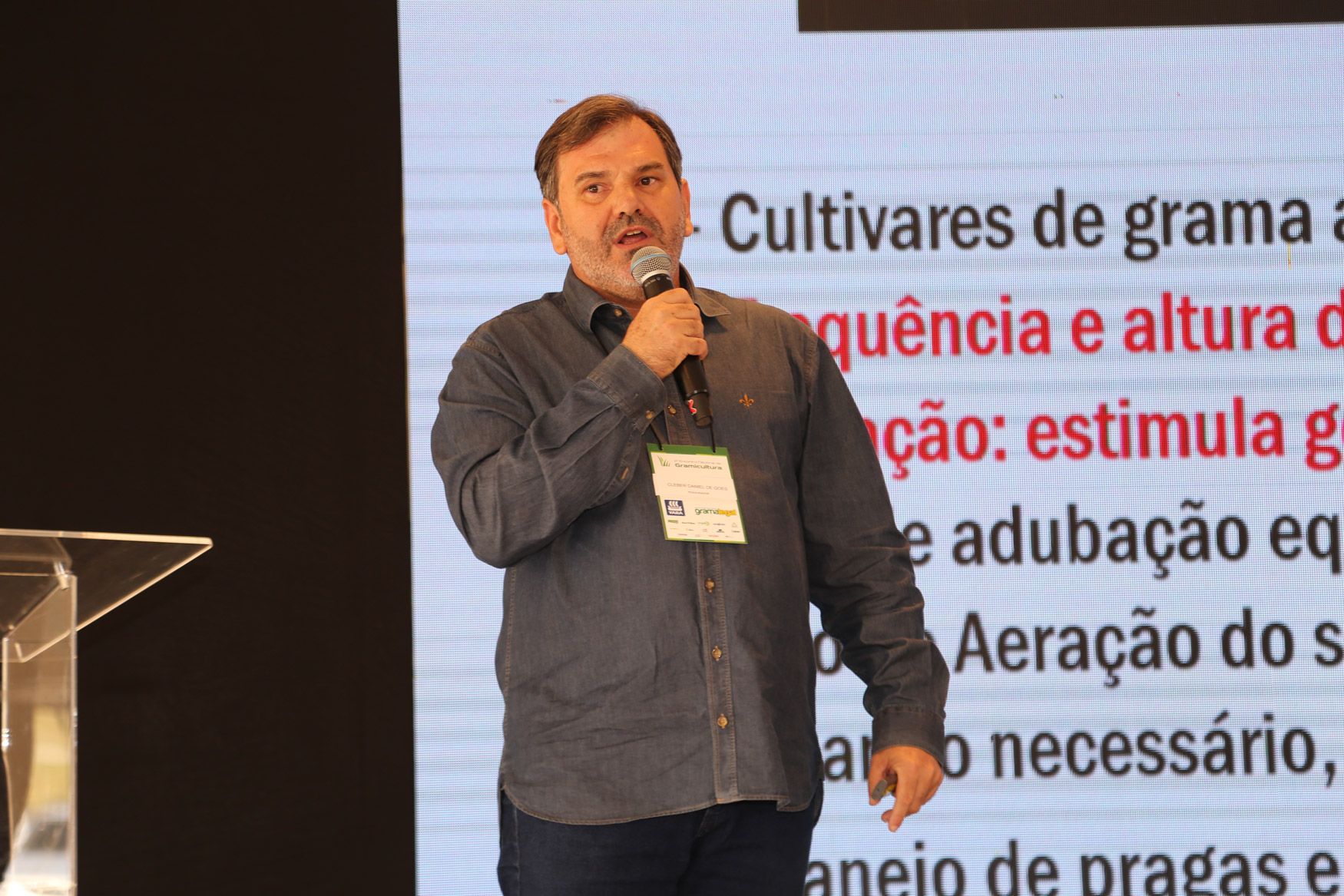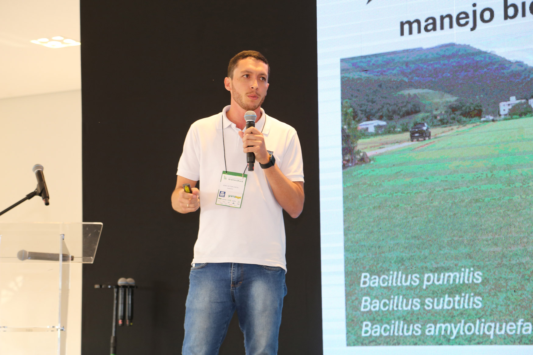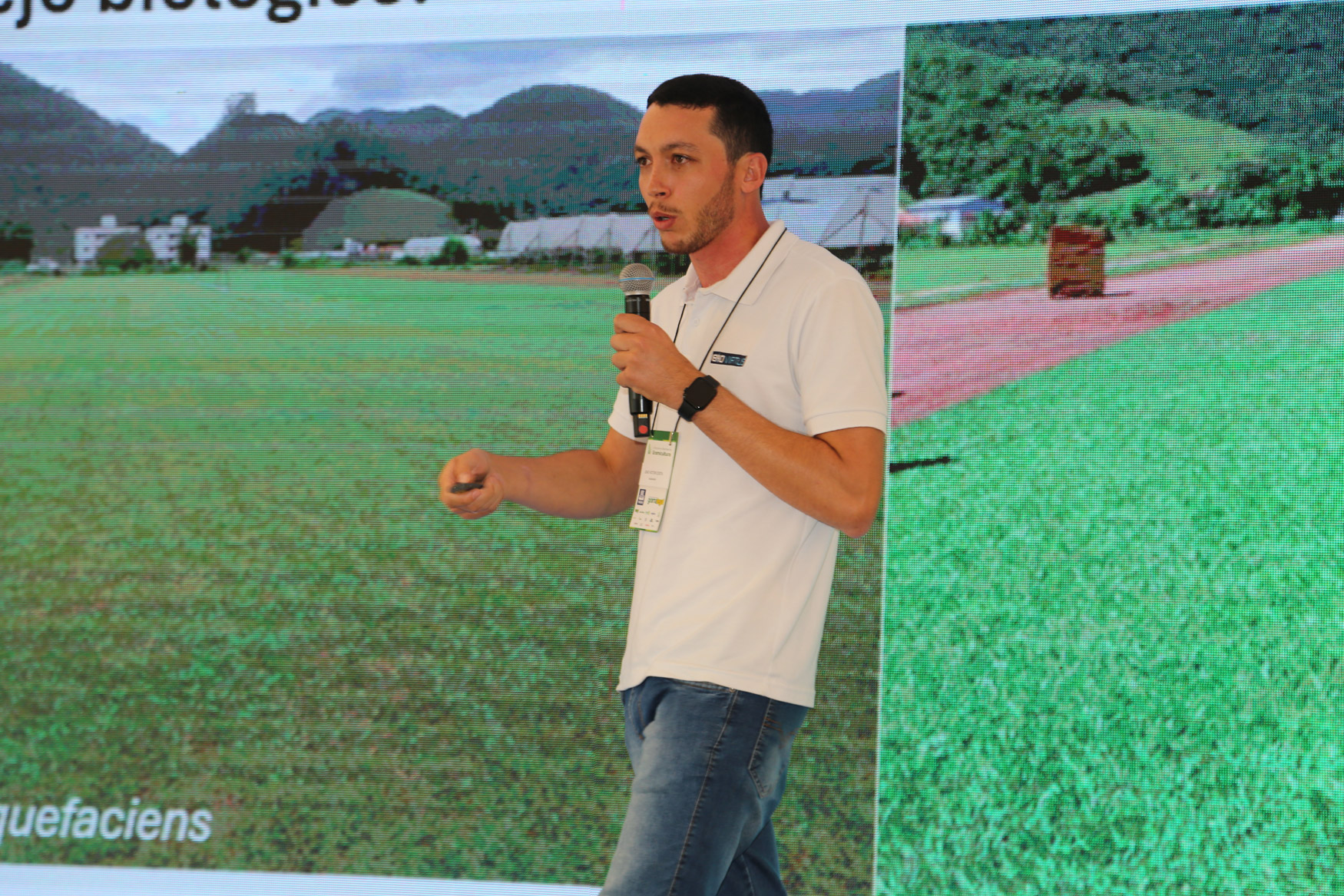 No encontro, abordamos novas técnicas para a implantação e manutenção de gramados, como preparo e correção do solo, plantio, irrigação, adubação, coberturas, corte adequado da grama, controle de pragas e combate a plantas daninhas.